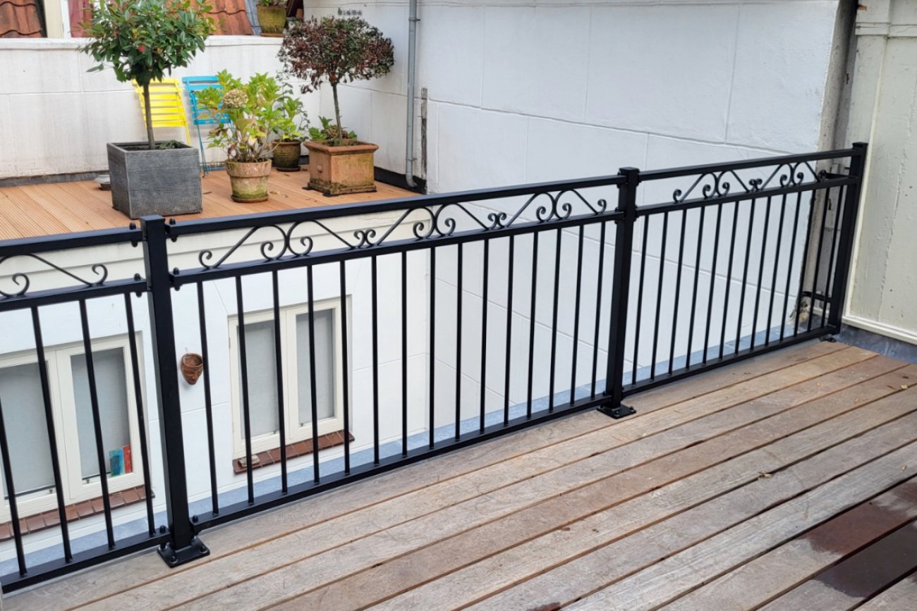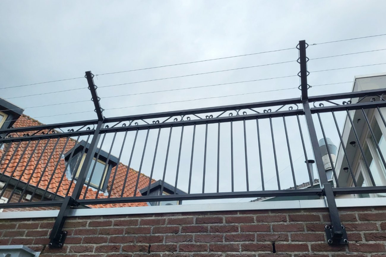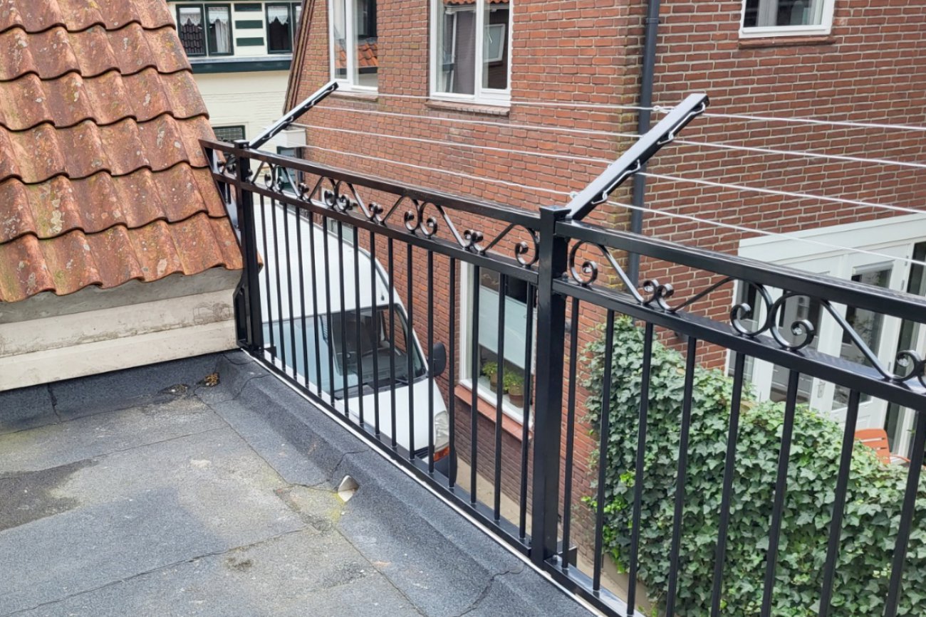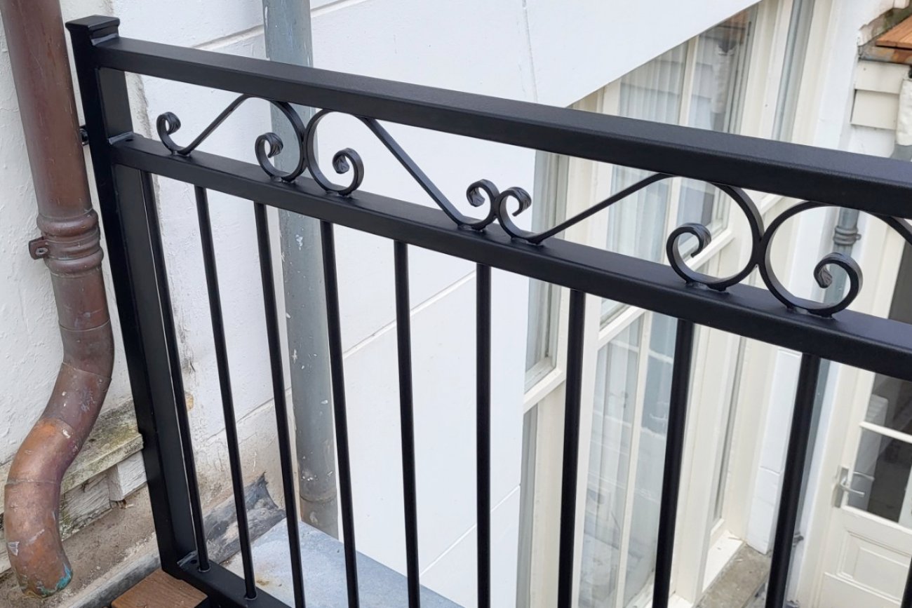 Kenmerkend voor balkonhekwerk F01 zijn de krullen aan de bovenkant van het hekwerk. Voor model F01 gebruiken we spijlen Ø 16 mm en is de maat tussen de spijlen nooit groter dan 100 mm. Hierdoor is het een kindvriendelijk hekwerk. |