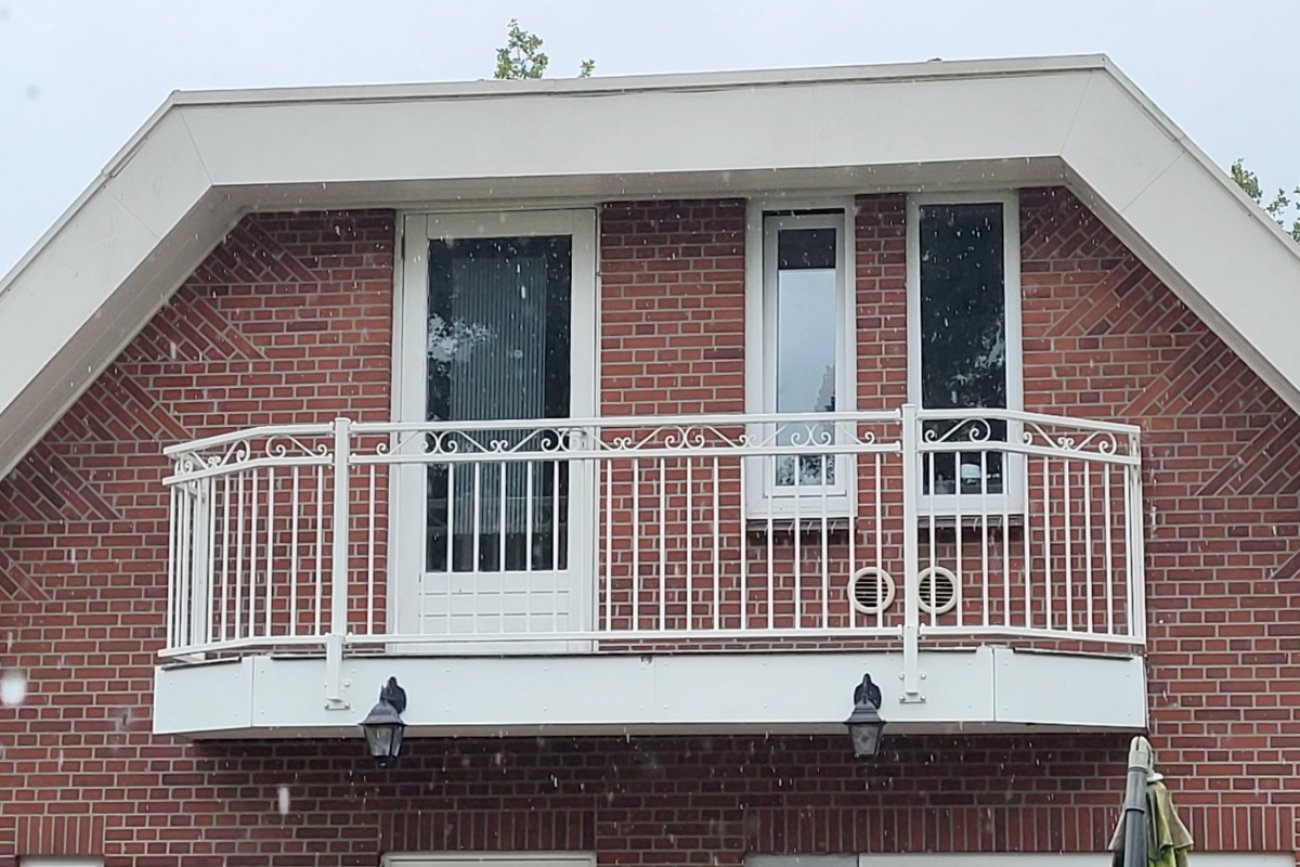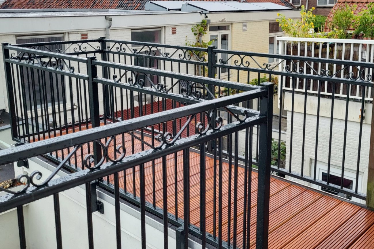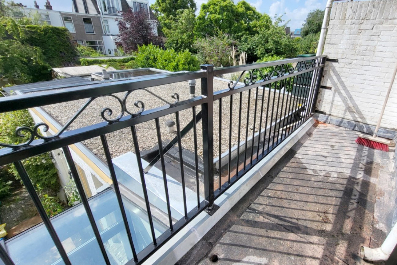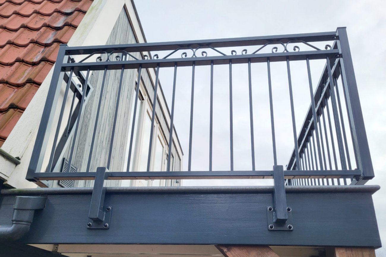 balkonhek met krullen aan de bovenzijde van het hekwerk. De sierlijke krullen tussen de bovenste twee horizontale kokers geven het hekwerk een stijlvolle uitstraling. Dit balkonhek is vervaardigd uit hoogwaardig staal en kan worden geleverd in bijna iedere gewenste RAL kleur. Het hekwerk wordt na bestellen speciaal voor u op maat gemaakt.