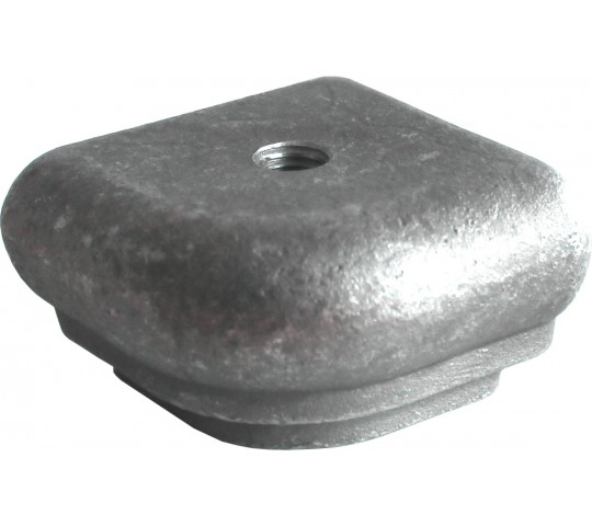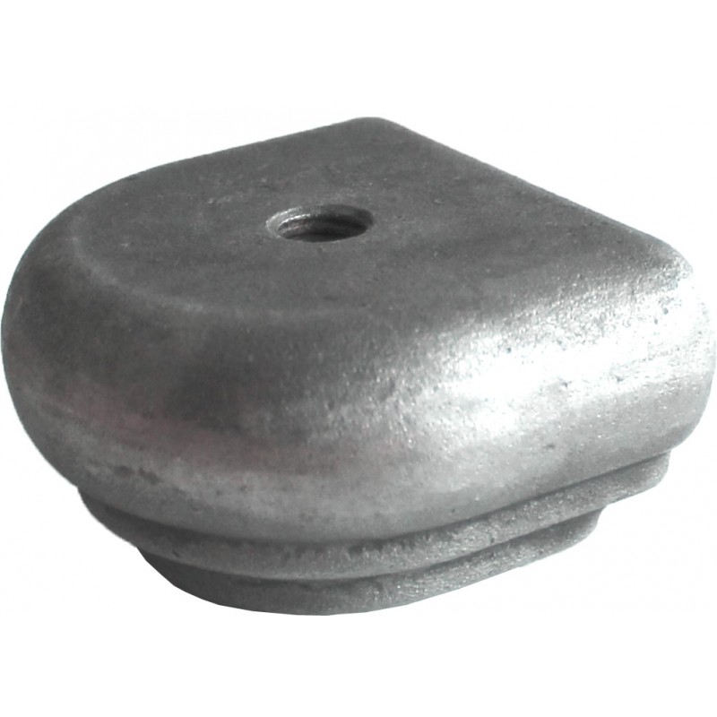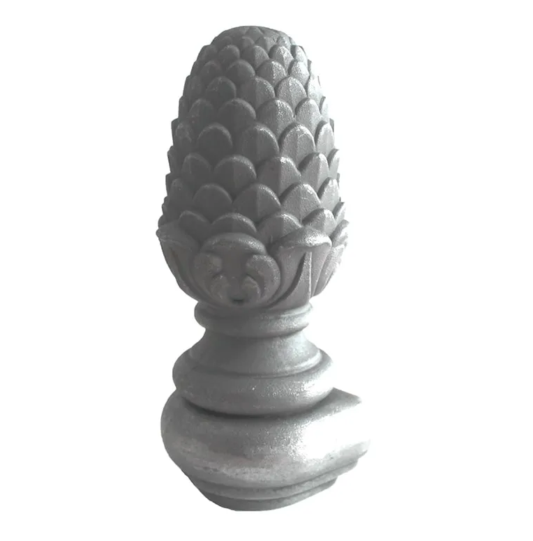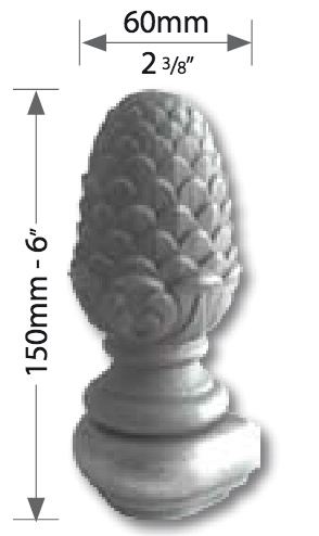 Grande Forge sierkop met dennenappel 60x150 mm, gemonteerd op stalen voet. Je kunt kiezen uit drie verschillende soorten voeten: een eindvoet, hoekvoet of doorlopende voet. De voeten kunnen op een paal gelast worden en zijn net als de sierkop zelf geschikt voor thermisch verzinken.