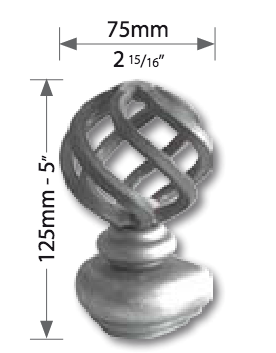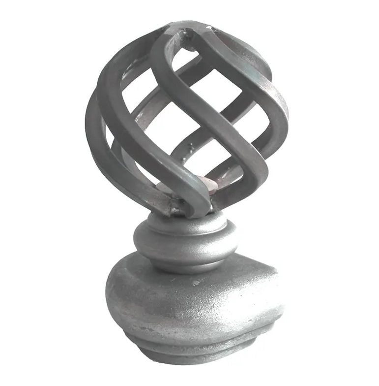 Grande Forge sierkop met gevlochten bol 75x125 mm, gemonteerd op stalen voet. Je kunt kiezen uit drie verschillende soorten voeten: een eindvoet, hoekvoet of doorlopende voet. De voeten kunnen op een paal gelast worden en zijn net als de sierkop zelf geschikt voor thermisch verzinken.