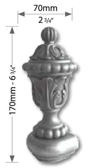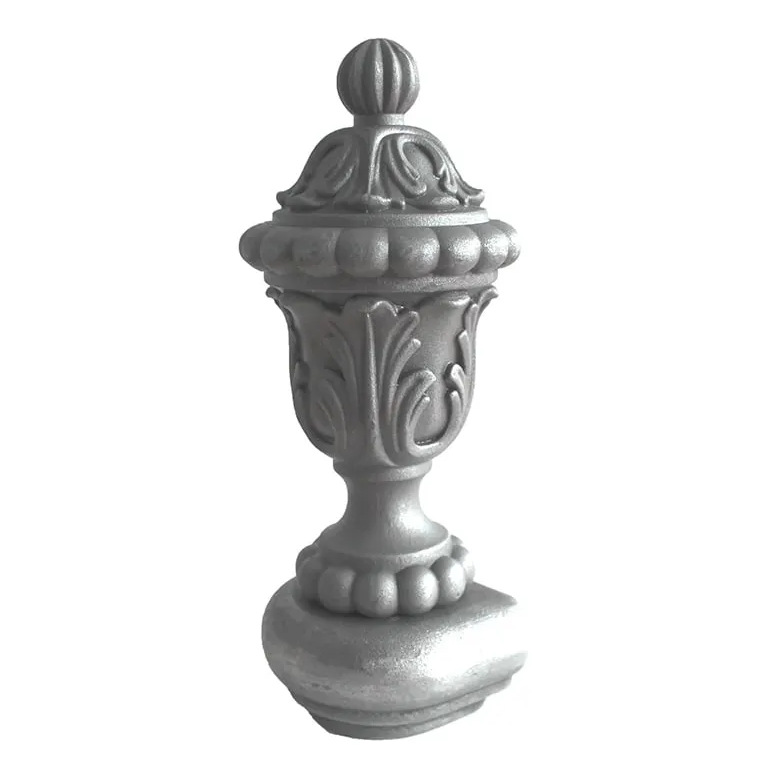 Grande Forge sierkop met sierlijk ornament 70x170 mm, gemonteerd op stalen voet. Je kunt kiezen uit drie verschillende soorten voeten: een eindvoet, hoekvoet of doorlopende voet. De voeten kunnen op een paal gelast worden en zijn net als de sierkop zelf geschikt voor thermisch verzinken.