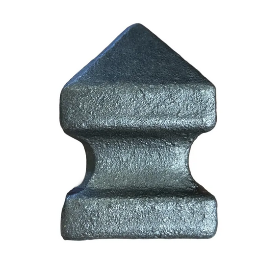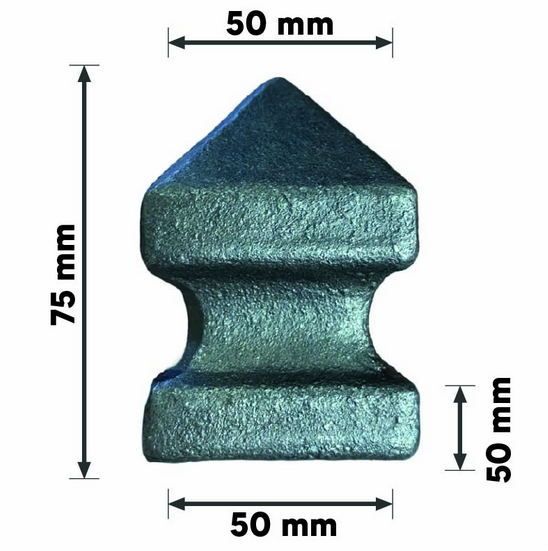 Massief gesmede paalkop met vierkante voet van 50x50 mm. De paalkop is 75 mm hoog en heeft aan de bovenkant een stijlvolle punt. Het smeedwerk is gemakkelijk te lassen en kan gebruikt worden als decoratieve afwerking aan de bovenkant van een paal.