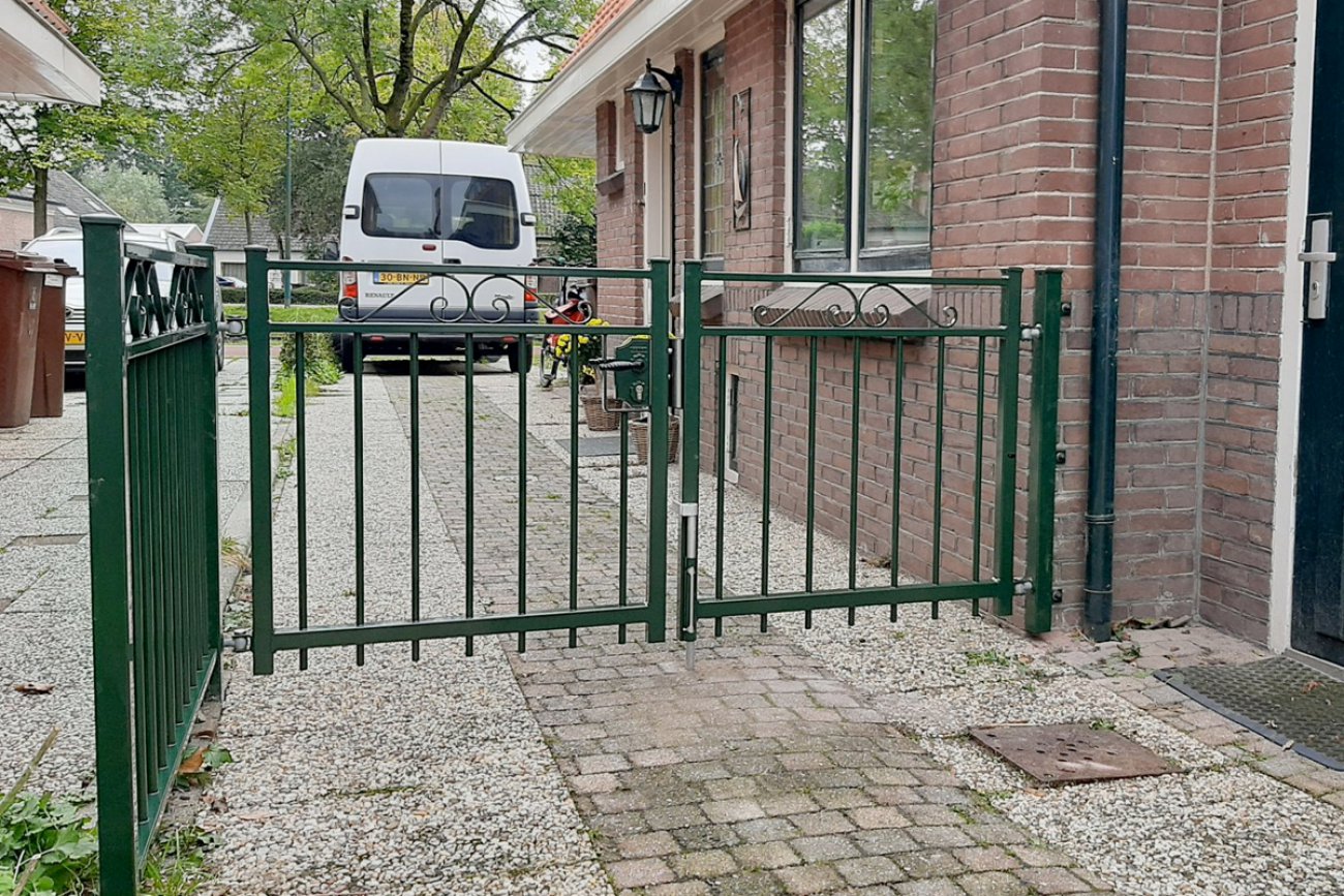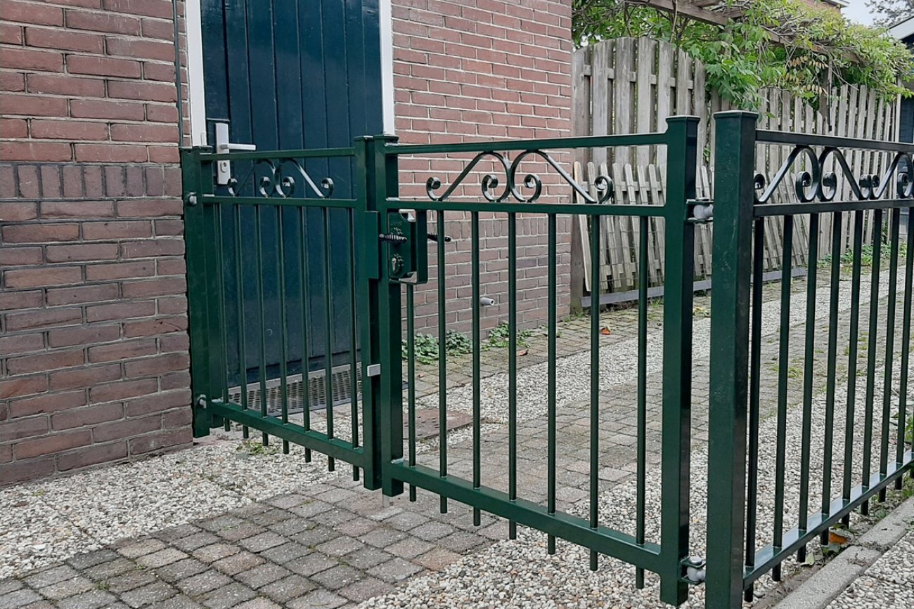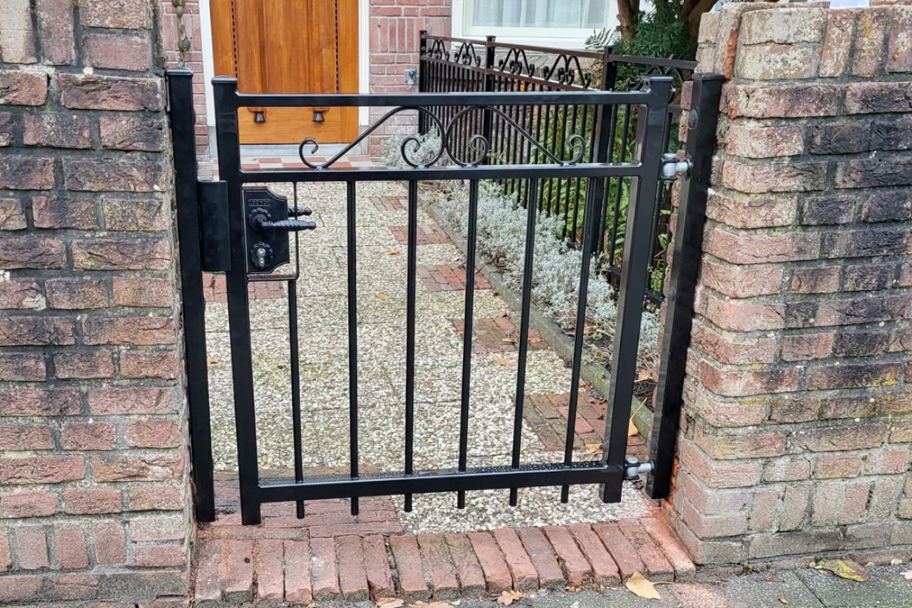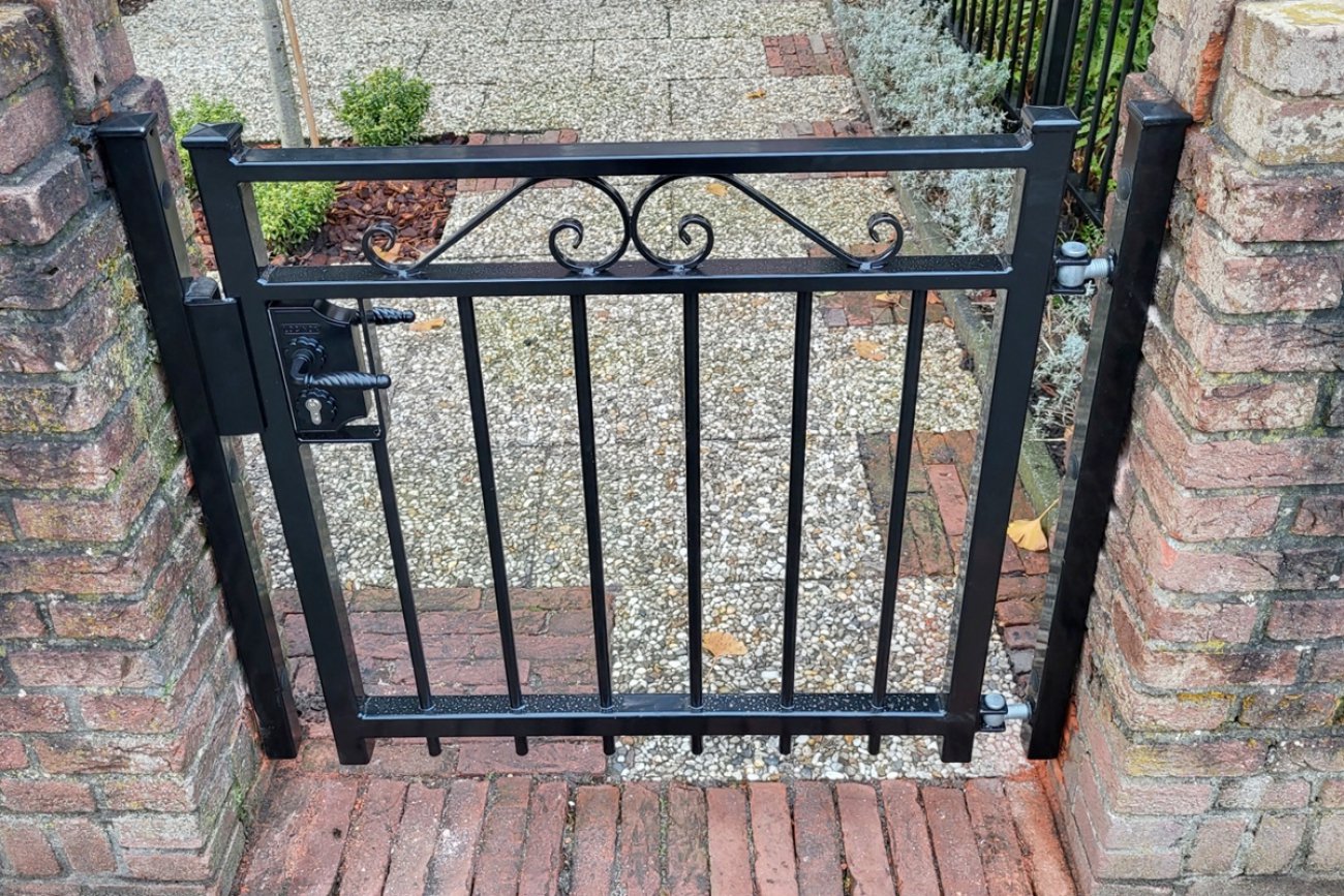 Een sierlijke looppoort met tussen de twee bovenste kokers prachtige krullen die deze poort tot een echte blikvanger maken. Het is een stevige poort die op maat gemaakt kan worden. Iedere gewenste afmeting is mogelijk. We leveren de poort zowel verzinkt als verzinkt en gecoat in een RAL kleur naar keuze.