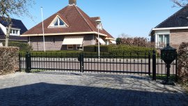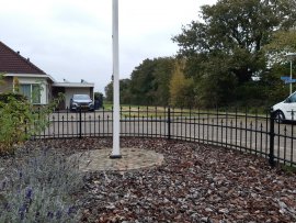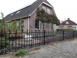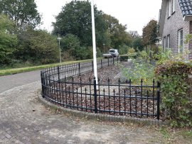 Het hekwerk heeft dikke spijlen (Ø 16mm) en horizontale liggers koker 40x20 mm. De palen zijn koker 40x40 mm en voorzien van een paalkop.